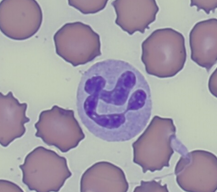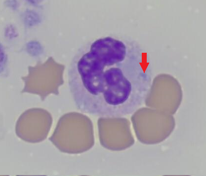 Nuclear swelling and Dohle bodies (arrow), 48 h old blood